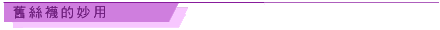 剪下破丝袜的足部,装进樟脑丸後,挂在衣橱内,可防止蛀虫。装上乾燥的香花,可让衣服阵阵飘香 2. 累积多数破损不用的丝袜,可代替木棉塞入坐垫中装入旧海绵,可当作刷子使用。 3. 可将洋葱装入旧丝袜中,挂在阴凉通风的地方,是保存洋葱的好方法。 4.将不用的肥皂块集中放在袜子中,可拿来洗洗脸槽 、浴缸等。 5. 在国外旅行时,丝袜穿破了总是立刻丢弃,其实可以把丝袜洗净後,装一些耳环、别针、硬币、小饰 品、印章等容易散落的东西,装好後打个结,取用 或携带十分方便,可以避免要用时找不到的烦恼。 |